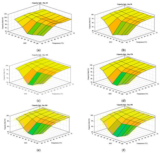 Experimental capacity-fade evolution from calendar aging test after 30 (a) 90 (b) 180 (c) 270 (d) 360 (e) 450 (f) days.