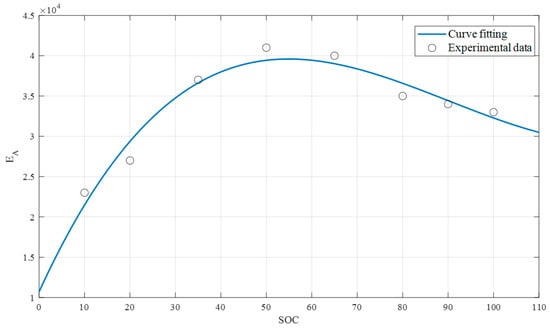 The Arrhenius plot is evaluated from Equation (9), after 270 days and for all storage SOCs, in order to verify that the capacity fade evolution obeys Equation (8). First, the linear relationship is verified at any SOC level, confirming the possibility of describing the capacity fade with Equation (8). After that, the activation energy EA is obtained for all SOC as the slope of the fitted line multiplied by the gas constant R. The activation energy as a function of SOC is estimated with a third order polynomial function Equation (11) as highlighted in Figure 8 where SOC is expressed as a percentage (from 0 to 100).