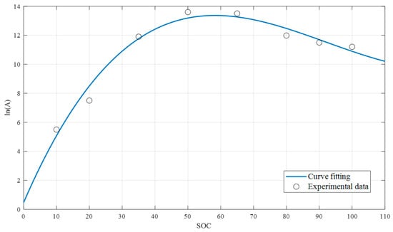 Curve fitting for the natural logarithm of coefficient a function of SOC.