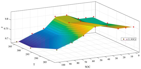 Surface fitting of the z coefficient as a function of temperature T and SOC.