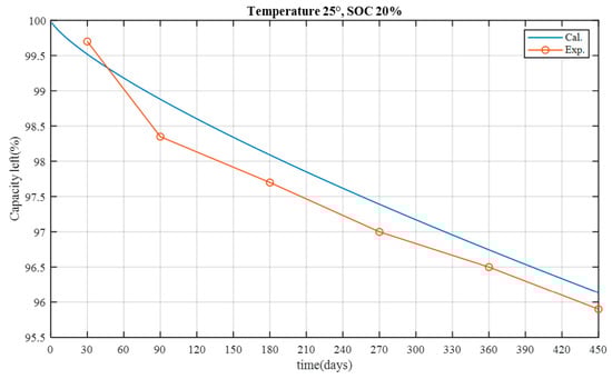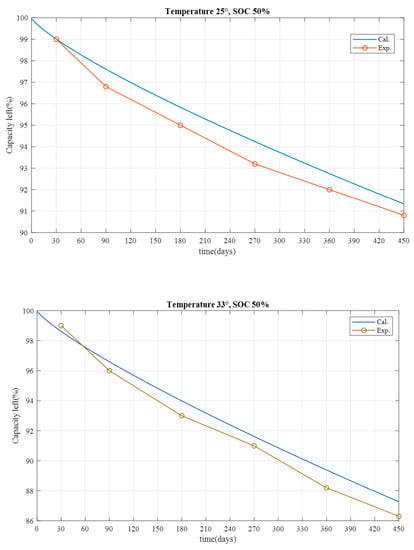 The complete calendar model equation is reported in Equation (13). The developed model is able to follow the evolution of the capacity fade with errors within 1%. In Figure 11, some examples for different SOCs and temperature are shown.