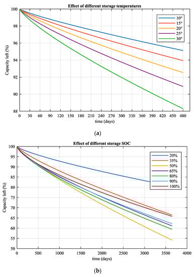 Calendar aging refers to the storage conditions, i.e., when the battery is not operating. In this condition, the capacity fade can be divided into a reversible capacity loss (RCL), also called self-discharge, that can be recovered recharging the battery after the storage, and an irreversible capacity loss (ICL), which is permanently lost [15]. The main parameter affecting calendar aging is the storage temperature T: the higher it is, the easier side reactions will occur. SOC is another important factor, as cell stored at high SOC show increased capacity fade. This could be explained by the higher potential disequilibrium at the electrode–electrolyte interface due to higher SOC [18,19,20,21].