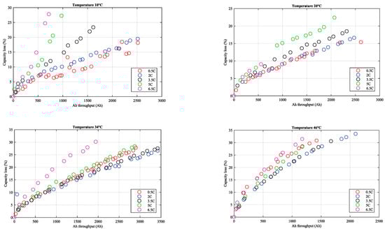 The cycle aging model developed in this work has been developed using the experimental results obtained using a NMC Li-ion cell with a nominal capacity of 1.5 Ah, that have been tested at 50% DOD, starting from SOC 100%, at four temperatures (10 °C, 20 °C, 34 °C, 46 °C) and five constant charge/discharge C-rates (0.5 C, 2 C, 3.5 C, 5 C, 6.5 C). The capacity fade evolution as a function of temperature and C-rate is shown in Figure 13.