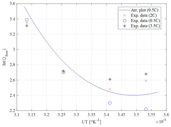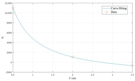 By rearranging Equation (13) as Equation (17), it is possible to evaluate the pre-exponential B coefficient from the intercept of the linear characteristic. The fitting function for the pre-exponential coefficient B as a function of C-rate equal a rational form as in Equation (18) (Figure 15).