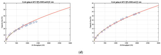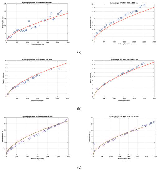 The operating temperature and the C-rate are not the only stress factors involved in the aging processes. The DOD and the middle SOC around which the cell is cycled also have an effect. All cells have been discharged with 50% DOD, which was only involved in the computation of the total charge throughput. On the other hand, DOD and mid-SOC influence on capacity fade has been highlighted in [17] for 2 Ah NMC Li-ion cells cycled at 35 °C and 1 °C. As it can be seen in Equation (21), the only inputs of the proposed model are the DOD (ΔDOD), middle SOC, as a function of the Open Circuit Voltage (V0), and the charge throughput.