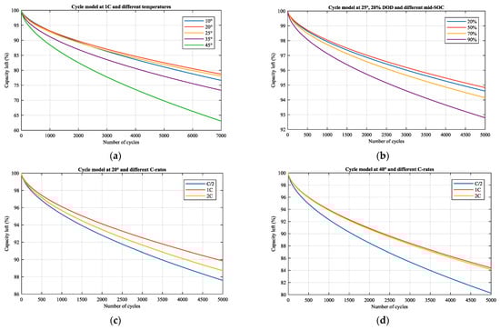 Cycle aging model comparison at different operating conditions: (a) 1 C at different temperature, (b) at different mid-SOCs (c) different C-rate at 20 °C (d) different C-rate at 40 °C.