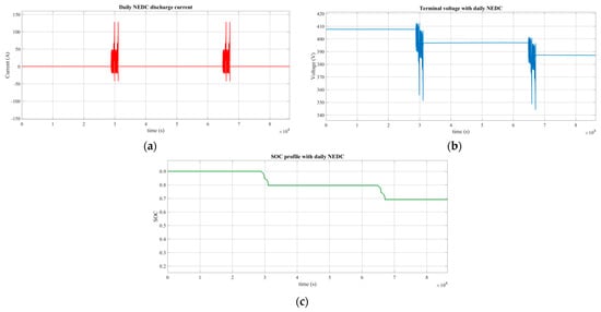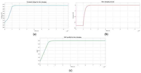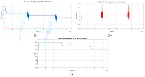 Electrical simulation results on Thursday for the no-V2G scenario: (a) terminal voltage, (b) terminal current, (c) SOC.
