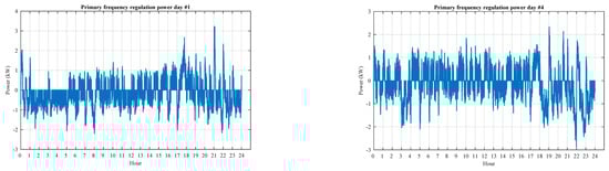 The power profile is obtained from the frequency oscillations data of the ENTSOE system over one week in September 2012 [35]. The values are updated every 4 s and used to compute the required regulation power. A droop characteristic (24) is considered, with a statism σ = 3%, a discharge/charge efficiency η = 90% and a nominal power for frequency regulation Pn = 50 kW, that corresponds to the nominal power for DC fast charging. The regulation power Preg is set to zero in the dead band between 49.990 Hz and 50.010 Hz.