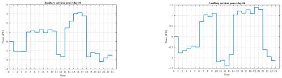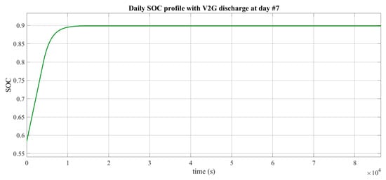 The battery pack is almost fully discharged on Mondays, but it can exploit the grid request for downward production on Tuesdays and Wednesdays. This corresponds to a load behavior with respect to a baseline program for the vehicle with p = 0. However, the limit SOC at 90% is reached on Wednesdays (day #3) and, then, the energy profile is cut off. The opposite occurs twice on Fridays (day #5), where the vehicle discharge is limited to SOC 30%. On Saturdays, the battery pack is subjected to the first slow charging up to SOC 50%. Finally, on Sundays (Figure 25) there is another recharge to restore the initial SOC of 90% at the end of the week.