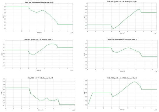 As for the scenario without V2G, on Monday morning the vehicle starts with its battery charged at SOC 90%. Current and voltage profiles have a similar evolution also during the other days of the week until Saturday, thus, they are not reported. The additional discharge in between the two daily journeys, due to V2G, is obtained by superimposing the power and energy profiles computed in the previous section. The SOC evolution during the different days is more interesting, and it is shown in Figure 24.