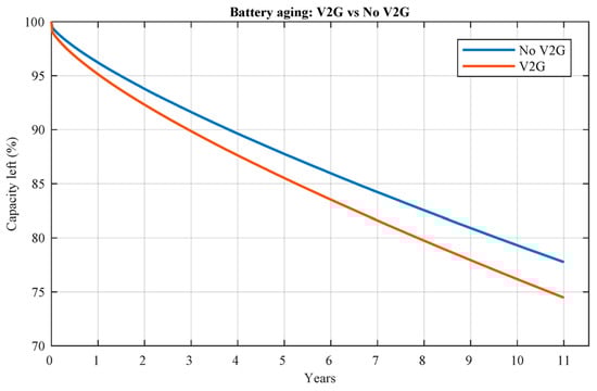 For the V2G scenario, the EOL at 80% of capacity left is reached after 7 years and 10 months approximately, with calendar and cycling contribution equal to 7.80% and 12.20%, respectively. The additional cycling reduces the battery lifetime by almost 2 years as it superimposes the calendar aging with shallow cycles. A comparison of the aging effect in the two scenarios is shown in Figure 26.