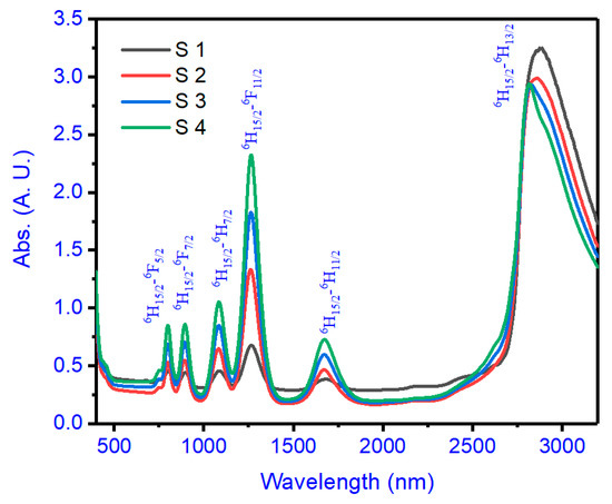 Absorption spectra of glass compositions (S1–S4) with their transitions.