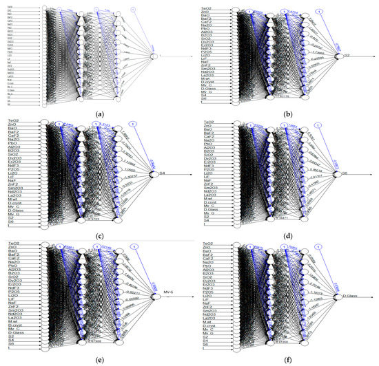 ANN architecture for all outcomes. (a) ANN architecture for forecasting the radiative lifetime, T. (b) ANN architecture for forecasting S2. (c) ANN architecture for forecasting S4. (d) ANN architecture for forecasting S6. (e) ANN architecture for forecasting Mv_G. (f) ANN architecture for forecasting D.Glass.