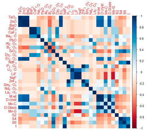 The model that exploited the ANN as an exercise model was resolved to be used for predicting the density, the parameters of Judd–Ofelt theory, Ω2, Ω4 and Ω6, and the radiative lifetimes of our inspected glass compositions, as listed in Tables S1 and S2. Over 35 glass compositions [44,45,46,47,48,49,50] were used in the learning model. The benefit of our model is that it allowed for the explicit mimicking of significant features of glasses without melting the raw oxide materials, relying on a number of theoretical parameters such as molar weights and oxide densities as inputs to the model to produce the expected outputs.