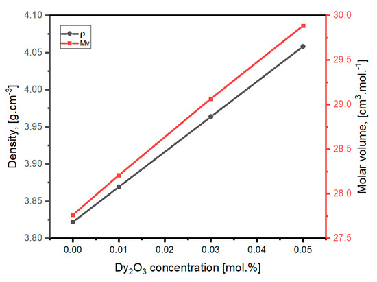 Table 1 displays the density as well as molar-volume data. Figure 4 displays the change in density after supplementation with various Dy2O3 mol percentages at the expense of B2O3. The density values were found to increase as the Dy2O3 mol percent increases. If we consider the additive rule of density, we can expect a rise in density values with the addition of Dy2O3. Dy2O3 has a density of 7.80 g/cm3, which is significantly higher than B2O3 (2.55 g/cm3) [36]. It is known that the structural unit of B2O3-based glasses gradually varies from BO4 units to BO3 with the rising the quantities of other components.