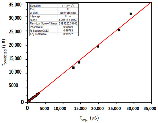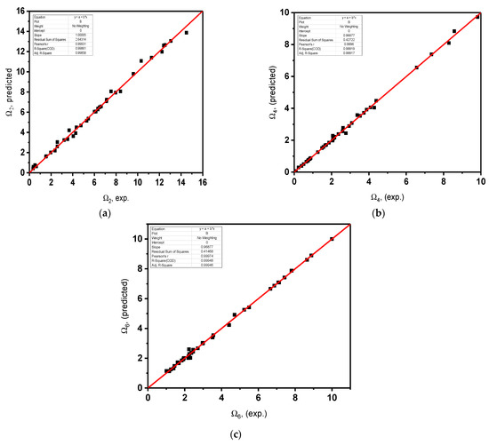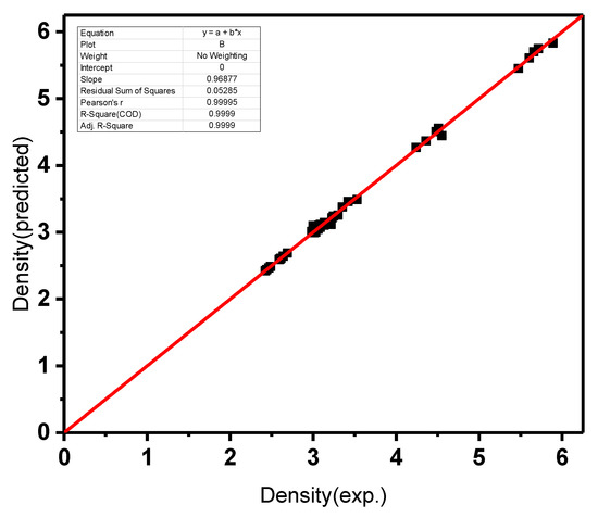 Figure 5, Figure 6 and Figure 7 display the variations of the experimentally gained values of density, molar volume, parameters of the Judd–Ofelt theory Ω2, Ω4 and Ω6, and radiative lifetimes with those that were predicted utilizing the resolved model in this work. The linear-regression process was utilized to display the agreement between the experimentally measured values and the values predicted using ANN. Solid straight lines display slopes that are within the unity domain, confirming the agreement between the experimental and predicted results. Every figure displays the slopes and correlation factors. Taking into account the uncertainties of the experimental data, the agreements in Figure 6 were very satisfactory. In all cases, the difference between the forecasted and experimentally obtained values was less than 0.5%, and in the inspected glasses, it was less than 5%. The proposed methodology can be a good alternative for problems in astrophysics, plasma physics, atomic physics, thermodynamics, electromagnetics, machines, nanotechnology, fluid mechanics, electrohydrodynamics, signal processing, power, energy, bioinformatics, economics and finance. Please see [24,25,52,53] and the citations therein.