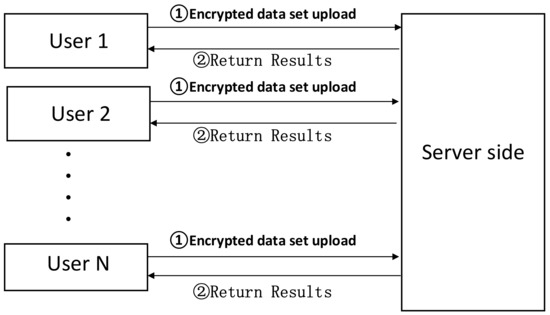 Homomorphic encryption satisfies both confidentiality and ciphertext manipulability, making it widely used in the field of privacy protection. The privacy protection model of outsourced computing based on homomorphic encryption is illustrated in Figure 1. The user encrypts the dataset to be outsourced and uploads it to the server-side (➀), where the server performs data processing of higher computational complexity; then the server returns the result to the user (➁).