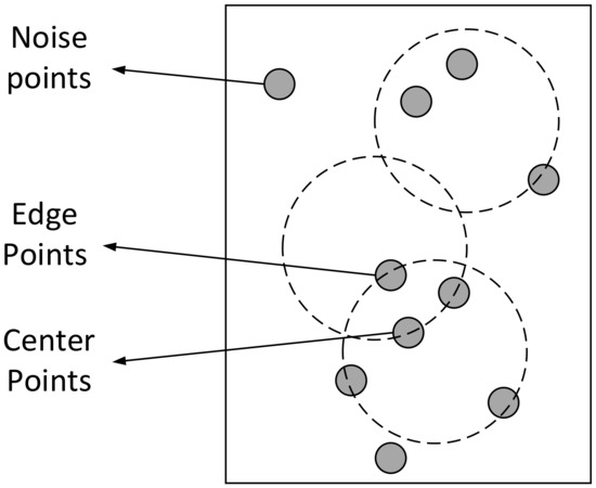 Some concepts of the DBSCAN algorithm are defined as follows: MinPts define the minimum number of data points required for a cluster, and the -neighborhood represents the area covered by a circle with a point as its center and as its radius. Centroids, i.e., the centers of clusters, contain more data points than MinPts in their -neighborhood; edge points, i.e., nodes at the edges of clusters, contain fewer data points than MinPts in their -neighborhood and are in the -neighborhood of other centroids; and noise points, i.e., other data points in the dataset that are not centroids and edge points. An instantiated depiction of the node definition is shown in Figure 2. In addition, Definition 2 and Definition 3 give the definitions of density reachable and density connected.