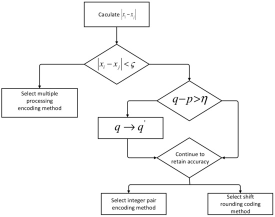 Let the dataset to be processed be . The number of digits in the integer part of the data is and the number of digits in the fractional part is (insufficient valid digits are filled with zeros). Select the larger number and the smaller number from and calculate the values of . Determine whether this absolute value satisfies , where is a user-defined threshold based on the characteristics of the dataset. If it is satisfied (i.e., the difference between the values is small), then the multiprocessing coding method is used directly to ensure data accuracy (in this case, the difference between the values in the set is mainly in the decimal part); if it is not satisfied, then it is further judged whether it satisfies , where is a threshold value set by the user according to the situation. If , the lower digit of the decimal part will be rounded off (approximately bits), i.e., the digit of the decimal part will be changed from to (so that ); otherwise, it will directly jump to the next step of judgment. At this point, it is necessary to take into account the retention accuracy and the subsequent calculation overhead to determine whether to choose the integer-pair coding method or the shift-rounding coding method: if the loss of data accuracy at this point has a greater impact on the subsequent calculation results, in order to improve the calculation accuracy, then choose the integer-pair coding method; if the loss of data accuracy has a smaller impact on the subsequent calculation results, then choose the shift-rounding coding method.