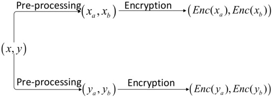 The sensitive information that needs to be protected in this solution is the coordinate value of each piece of data, which is floating-point data, so a suitable pre-processing algorithm needs to be chosen according to the characteristics of the dataset and the encryption scheme chosen in this solution. In this paper, two floating-point datasets A and B are selected. The number of decimal places in the data in A is large, but the difference in the size of the values is large, and the number of decimal places is much larger than the number of integer places, so, according to the selection process shown in Figure 3, the integer-pair coding method or the shift-rounding coding method can be considered, and the decimal places are rounded off. The differences between the data in B are large and the number of fractional digits is not significantly different from the number of integer digits, so integer-pair coding or shift-rounding can also be considered, based on the selection methods described above. The encryption process, after processing the data using the integer-pair encoding method, is shown in Figure 4.