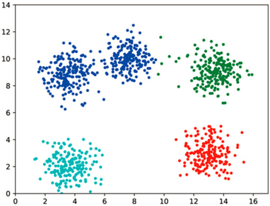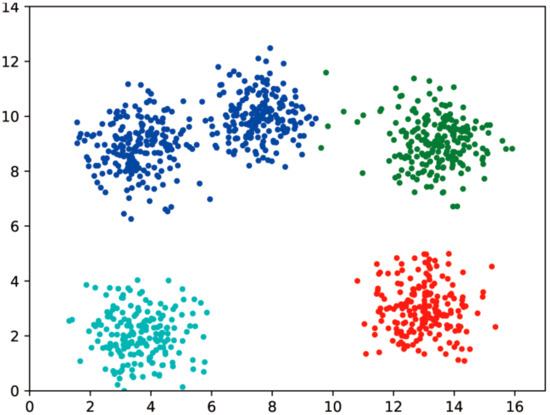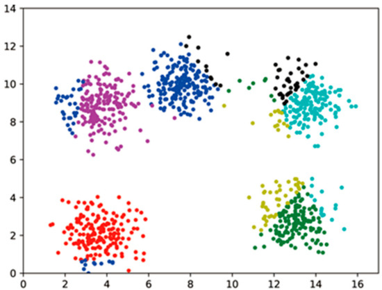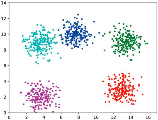 Dataset A and dataset B are encrypted by shifting and rounding, and then homomorphic clustering is performed on the encrypted data. The data in dataset A was shifted and rounded, with 3, 4, and 5 decimal places retained, and then the homomorphic clustering algorithm was performed on the cipher text. The clustering results after decryption are shown in Figure 9, Figure 10 and Figure 11. The dataset B is directly encoded by shift rounding, encrypted and homomorphic clustering is performed; the clustering results obtained by decryption after the calculation are shown in Figure 12.