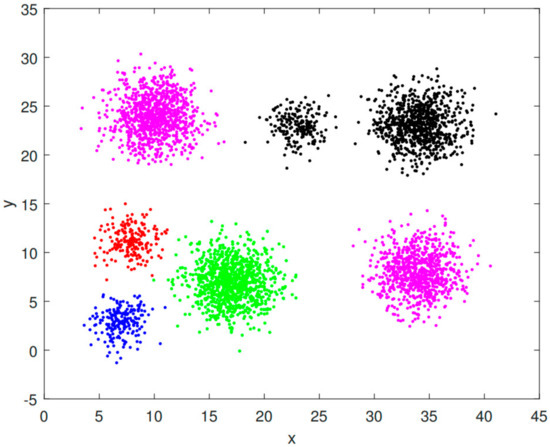 That the data available to the cloud server, or an adversary with eavesdropping capabilities, is and the parameters , MinPts. In terms of the composition of the data, with the exception of MinPts, all are ciphertexts obtained through BGV homomorphic encryption. The probability of the cloud server and the adversary successfully obtaining the user’s original data without knowing the private key is equivalent to the probability of breaking the BGV algorithm. From the semantic security of the homomorphic encryption algorithm, it is clear that the probability of breaking the BGV algorithm is negligible and therefore the probability of the cloud server and adversary successfully obtaining the user’s data is also negligible. The only plaintext in the data available to the cloud server or adversary is MinPts, which only indicates the minimum number of data contained in the clusters and does not reveal any of the user’s data.
