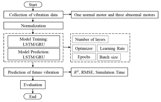 The proposed approach of LSTM- and GRU-based vibration forecasting is described in this subsection. Figure 1 shows the flowchart of the proposed simulation approach.