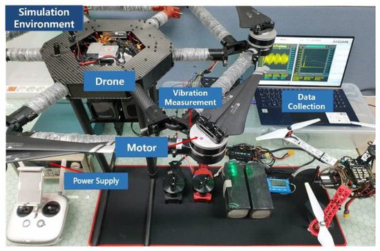 Figure 2 demonstrates the configuration of the simulation environment to collect time series vibration data from the motor connected to the drone propeller. The constant velocity, maximum power, and maximum torque of the motor used in the simulation are 180 Kv, 1484.6 W, and 1.992 N⋅m, respectively. In order to collect the vibration data from one normal motor and three abnormal motors, the motor frequency was set to 20 Hz, which is 1200 RPM rotation rate.