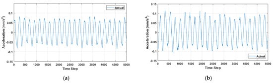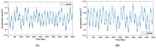 Figure 3a–d show a total of 5000 vibration data collected from a normal motor, a motor with low power, a motor with a damaged rotor, and a motor with a bent shaft. The waveforms of vibration data collected from the normal motor show constant period and acceleration values, as shown in Figure 3a. However, Figure 3b demonstrates the vibrations of a low-power motor, which shows vibrations similar to those of a normal motor, but with reduced acceleration and more vibrations at the waveform’s end. The vibration waveforms in Figure 3c,d exhibit the instability in the period and acceleration compared to the vibrations of the normal motor in Figure 3a.