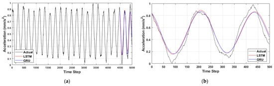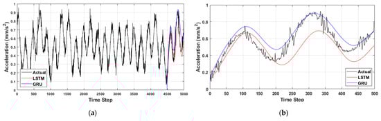 The black graph in Figure 6a,b represents the actual vibration waveform of the normal motor collected from an actual drone, while the blue and red graphs represent the predicted vibration waveform obtained by training LSTM and GRU with 90% of the 5000 samples of vibration data and using the remaining 10% as the test data for predicting future vibration. Figure 6b shows the actual vibration values of 500 time steps, 10% of the total 5000 time steps, and the predicted vibration values using LSTM and GRU.