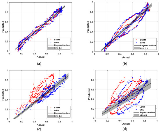 The predicted vibration values using LSTM and GRU are very close to the actual vibration values, as shown in Figure 10a, and all dots are located close to the line. Figure 10a shows that both LSTM and GRU predicted very close to the actual vibration value. Figure 10b shows similar results to Figure 10a, but the graph shows that the accuracy of the vibration values predicted by LSTM and GRU decreases due to its destabilization of the low-powered motor. Figure 10c shows that the vibration value predicted by the GRU is closer to the actual vibration value than the vibration value predicted by LSTM. Figure 10d shows that both LSTM and the GRU predict future vibrations with similar accuracy. Figure 10 shows that the confidence interval range of a normal motor is the narrowest and the value is the highest. However, the C.I range of the motor with a damaged rotor is the widest.