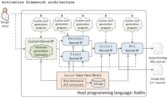 To support the explicit implementation of custom execution models, inferred from microarchitectural templates, and hardware designs based on them, original open-source ActiveCore framework is being developed by the author []. ActiveCore is a software library of hardware generators providing custom programmable kernels constructed in accordance to certain microarchitectural template. Each such kernel (designated as “Kernel IP (KIP) core”) offers hardware description within custom execution model inferred from computational process organization inside hardware microarchitecture, applies microarchitecture-aware optimizations, and generates design specifications in standard RTL/HLS form [,,].