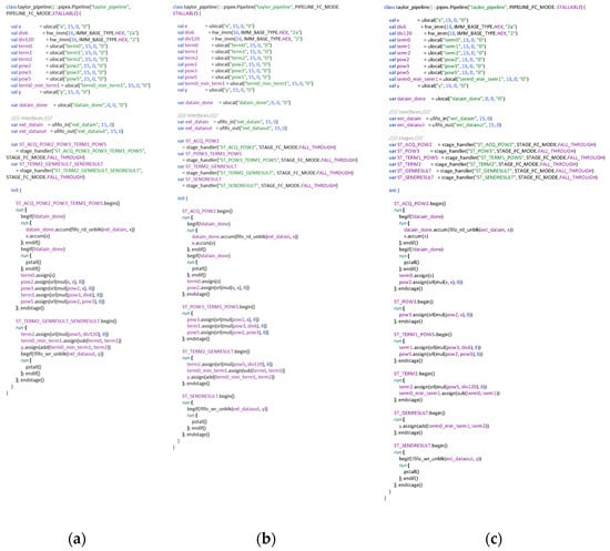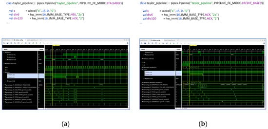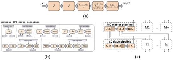 Since functionality of stages is defined externally to Pipex KIP core, it can be used to implement functionally differentiated designs that share common pipelined organization. In Figure 4, three such examples are presented: sine wave generator based on Taylor series, Aquaris RISC-V CPU cores (with one to six pipeline stages and optional M and custom-0 pipelined coprocessor interfaces), and master/slave pipelines in Ariele full crossbar matrix generator. The CPU cores have been verified using open RISC-V compliance verification suite available at https://github.com/riscv/riscv-compliance (accessed on 12 February 2022). These generators allowed to hit (depending on configuration) up to 185 MHz on 7-series Xilinx FPGA device and above 90% per-core reuse of codebase between the CPUs and 63% between CPU and bus matrix generators [].