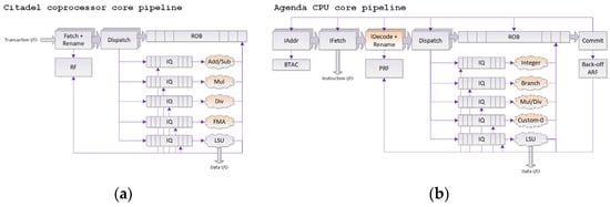 Based on Reordex, two demo designs have been proposed: Citadel FPU coprocessor and Agenda RISC-V CPU core (see Figure 7). FPU coprocessor consists of five pipelines (two adding/subtraction, multiplication, division, FMA), whereas Agenda CPU has been programmed to support RISC-V (RV32IM) ISA. Both designs have been synthesized for 7-series Xilinx FPGA devices. Depending on the configuration, FPU hit up to 122 MHz on the Artix-7 (xc7a100t) device [], and Agenda CPU hit up to 90 MHz on the Xilinx Kintex-7 (xc7k325t) device, which are typical numbers for complex out-of-order cores without FPGA-specific optimizations.
