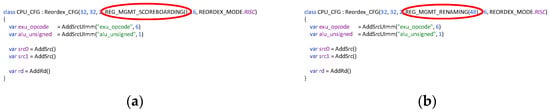 Configuration object example for Reordex KIP core: scoreboarding (a) and register renaming (b).
