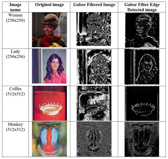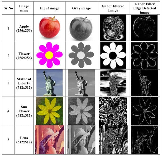 The results given in Table 1 are obtained for the images applied with the Gabor filter-based edge detection method. PSNR and MSE results are calculated for each image in Table 1 with the help of Equations (19) and (20). The obtained PSNR and MSE values obtained for the image ‘Apple’ are 10.4857 and 5.8602 × 103. The PSNR value for ‘Flower’ image is 9.2483, and the MSE value is 7.7920 × 103. The PSNR and MSE values gained for image ‘Lena’ is 11.8913 and 4.2398 × 103; for the remaining input images, the output values are given in Table 1.