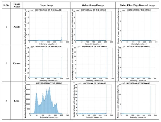 This section presents the implementation and performance comparisons, among the various methods discussed in the literature. The numerical outputs obtained from the proposed design are validated in the MATLAB environment. Our objective is to detect or extract clean edges. The histograms for the original images for ‘Apple’, ‘Flower’ and ‘Lena’ are shown in Figure 7. Figure 4 shows the edge information for image ‘Lena’ at various directions and frequencies. Histogram outputs for the images applied with Gabor filter are shown in Figure 7. The histogram calculated for the images produces a graph between intensity levels on the X-axis and the number of pixels on the Y-axis. The X-axis contains all gray levels and the Y-axis denotes the number of pixels that have a particular gray-level value.