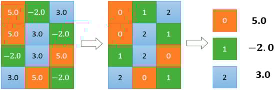 Quantization in the traditional sense refers to discretizing continuous signals [], for example, changing people’s continuous sound signals into discrete digital signals. Taking weight quantization as an example, the quantization in neural network refers to changing the weights stored in the form of float32 into int8, int4, int2 and other types, reducing the size of their representable space, and establishing the corresponding mapping relationship, as shown in Figure 3. The purpose of neural network quantization is also to reduce the space occupied by the weights of neural networks. However, unlike pruning, quantification solves the problem in the storage form of parameters, while pruning directly removes redundant connections in the network.