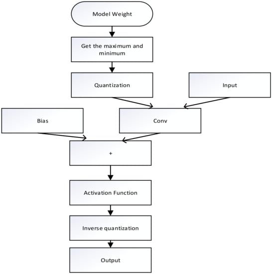 Model quantization is mainly divided into two steps: quantization and inverse quantization. The whole process is to first input the float-type weights in the model, obtain the maximum and minimum values of the weights, quantify the weights according to them, and then retrain until the network converges. At the same time as training, finding the corresponding relationship to inverse quantize the output values to obtain the final result. The whole process is shown in Figure 4.