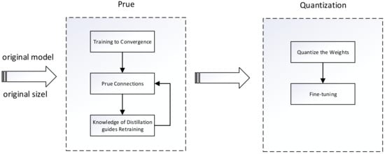 The algorithm proposed in this paper is mainly divided into two stages—the pruning stage and the quantization stage. In the pruning stage, we introduce knowledge distillation to guide the training model and improve the accuracy of the model. Then, the weights of the pruned model are quantified to further reduce the model size and computational power consumption. The whole flow chart is shown in Figure 5.