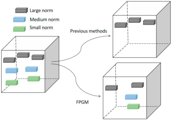 The pruning method used in this paper is filter pruning via geometric median (FPGM) proposed by He et al. []. Previous filter pruning methods assume that the smaller the norm of the filter, the smaller its contribution to the network [,]. Removing those filters with a norm close to zero would not seriously affect the performance of the network. However, this approach actually contains two implicit conditions: