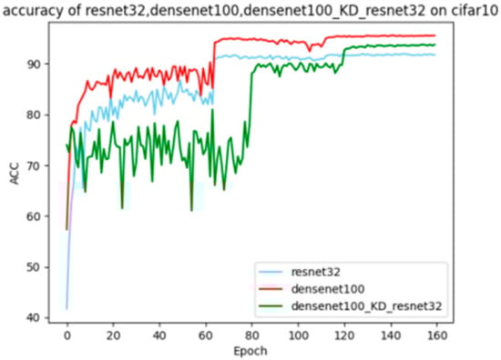 Taking the fusion and pruning of the resnet32 network as an example: First, we used the resnet32 model and densenet100 model to perform knowledge distillation on an 18-layer network handwritten by ourselves under the same temperature and weight (here we still set a larger weight for the teacher), the improvement is = 1.46%, = 3.41%, and according to the idea of determining weights in Section 3, α = /( + ) = 0.29, β = /( + ) = 0.71. According to the data in Table 2, it can be seen that the assigned weight was very appropriate. Figure 9 shows the graph of the change in accuracy of the DenseNet guiding the ResNet training process.