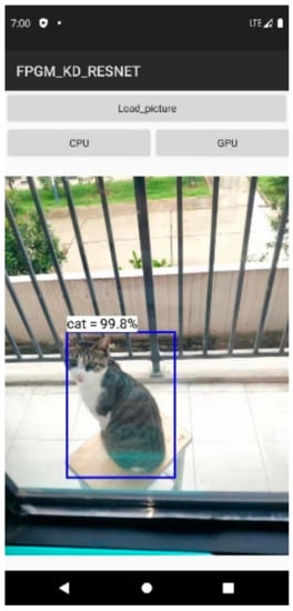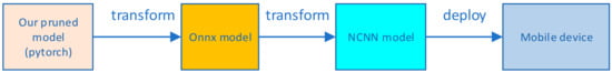 The ultimate goal of studying model compression techniques is to deploy the model on mobile embedded devices. Therefore, in this part, we deployed the model compressed by the algorithm proposed in this paper on the mobile side. Android Studio was used to simulate this deployment. The simulated mobile phone environment was Android 11.0, and the mobile phone model was Pixel 4. According to the flow chart shown in Figure 10, the Pytorch model was first converted into ONNX intermediate format and then into NCNN model. Then the model was deployed to APP with the help of NCNN framework, and the final display effect is shown in Figure 11. Furthermore, we compared the time required for the original model and the pruned model to process the same input image, and the results are shown in Table 4.