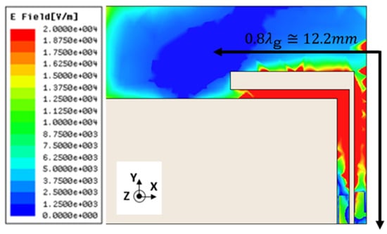 Figure 2. Electric field strength distribution on surface metal (9.0 GHz). A strong electric field distribution can be confirmed in the figure from the feeding point along the L-shaped slot.