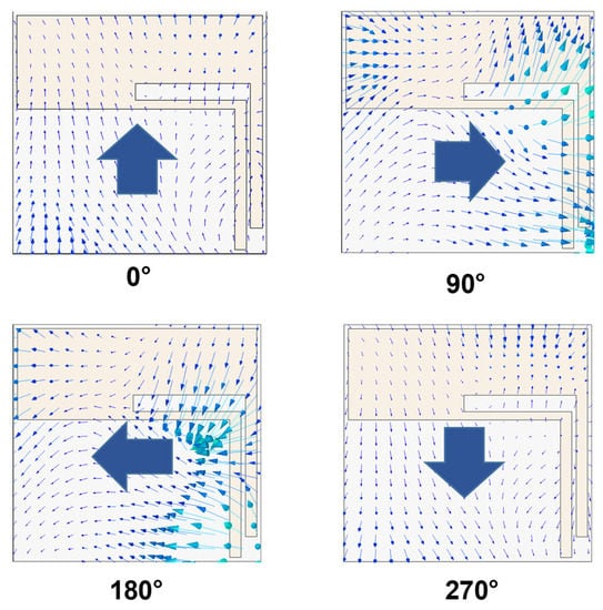 Figure 3 shows the electric field strength distribution at 9.0 GHz in the distant field of the antenna element. It can be confirmed that the direction of the electric field vectors changes in a rotating manner as the phase of the input power changes. This signifies that the circularly polarized waves are radiating in the +z direction, in which the radio waves propagate. For the proposed antenna, it can be concluded that left-handed circular polarization (LHCP) occurs in the frontal direction when the electric field distribution is changing in the counterclockwise direction (as observed from the −z direction). Right-handed circular polarization (RHCP), which is equivalent to the frontal direction, is typically observed in the back direction. However, since the antenna was loaded with a floating metal on the back, RHCP was suppressed.