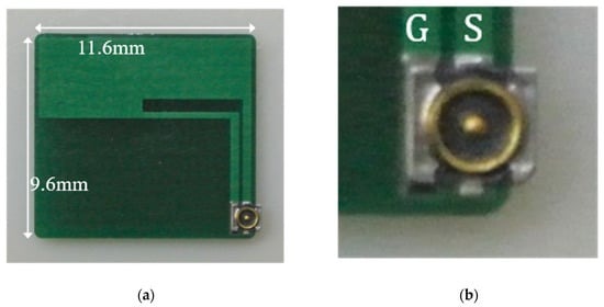 The antenna element was prototyped using the board manufacturing and mounting service of P-ban.com Corp. Figure 4a shows a front photograph of the prototype board. The board surface was surface-treated with a lead-free solder leveler (which is RoHS-compliant), and a green solder-resist mask was applied to both sides. The board material was FR4 with a thickness of 1.6 mm, and the copper foil pattern measured 18 μm in thickness. Figure 4b shows an enlarged view of the connector part. The connector was a board-mounted co-axial connector manufactured by Murata Manufacturing Co., Ltd. (MM5829-2700) and was used in the simulation model. In the connector, the central pin provided the signal, and the outer two pins were grounds. As such, they were attached to the antenna element such that the left ground and central signal adhered to each other.