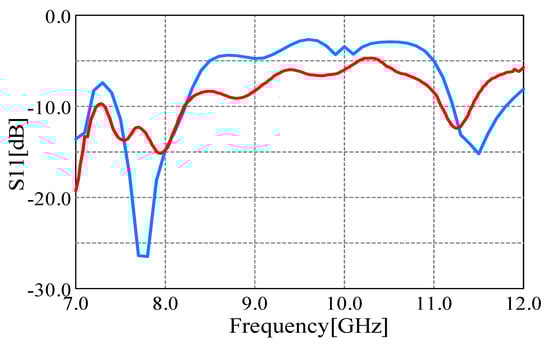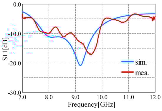 Figure 5 shows the simulation and measurement results of the S11 characteristics. The simulation results show that the resonance frequency was 9.10 GHz, and the S_11 < −10 dB band was satisfied in the 1.90 GHz range from 7.82 to 9.72 GHz. Moreover, the S_11 < −10 dB band was satisfied in the 1.04 GHz range from 8.88 to 9.92 GHz.