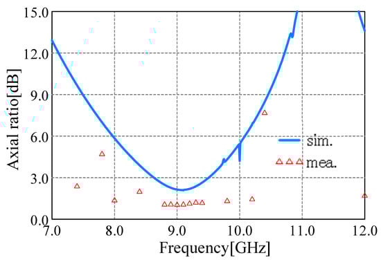 Figure 6 shows the simulation and measurement results for the axial ratio characteristics. The simulation results show that the axial ratio (AR) < 3 dB band was satisfied in the 1.09 GHz range from 8.54 to 9.65 GHz. The measurements obtained at 15 frequencies from 7.4 to 10.2 GHz were similar and satisfied the simulation results for the AR < 3 dB band. In the experiment, we measured the gain in the vertical polarization and the horizontal polarization and took the difference. In the part of Figure 6 where the gain is high, the AR is smaller, so good circular polarization is generated, which is better than the design value. On the other hand, where the gain is small in Figure 6, the received power for the vertical and horizontal polarization is small, so a difference is created in the noise, and thus the SN of the low-gain area is poor and may not match the design value.