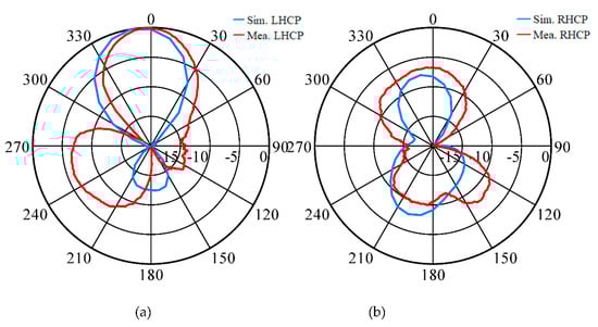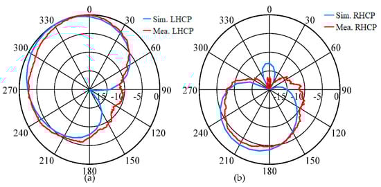Figure 7. Radiation pattern @ 9.0 GHz. (a) Left-handed circular polarization (LHCP) (xz-plane) and (b) right-handed circular polarization (RHCP) (xz-plane).