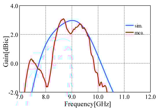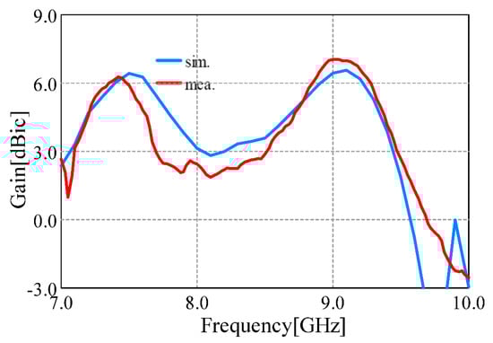 Figure 8 shows the measurement and simulation results for the frequency characteristics. The maximum gain in the simulation results was 3.3 dBic @ 9.02 GHz, and the 3-dB gain-band was 2.43 GHz (7.74–10.17 GHz). The maximum gain in the measurement results was 3.04 dBic @ 8.83 GHz, and the 3-dB gain-band was 1.63 GHz (8.23–9.86 GHz).